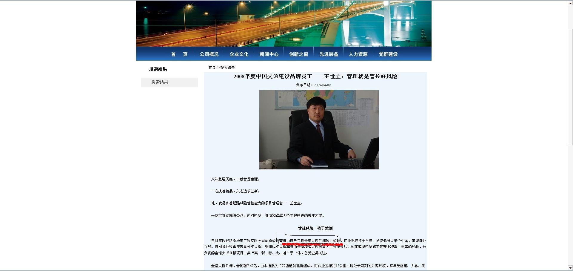 記者從路橋建設(shè)的網(wǎng)站上獲悉,現(xiàn)任路橋華東黨委書記王世寶的個人履歷介紹中顯示:“王世寶憑借在海域橋梁施工管理上積累的豐富經(jīng)驗,擔(dān)任金塘大橋第Ⅱ合同段項目經(jīng)理。”